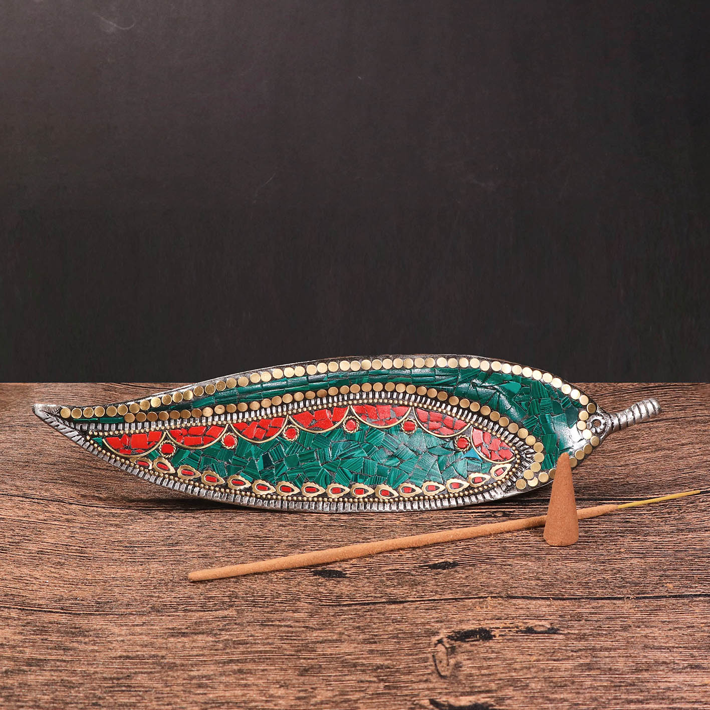 Malachite and Coral Inlaid Leaf Incense Holder