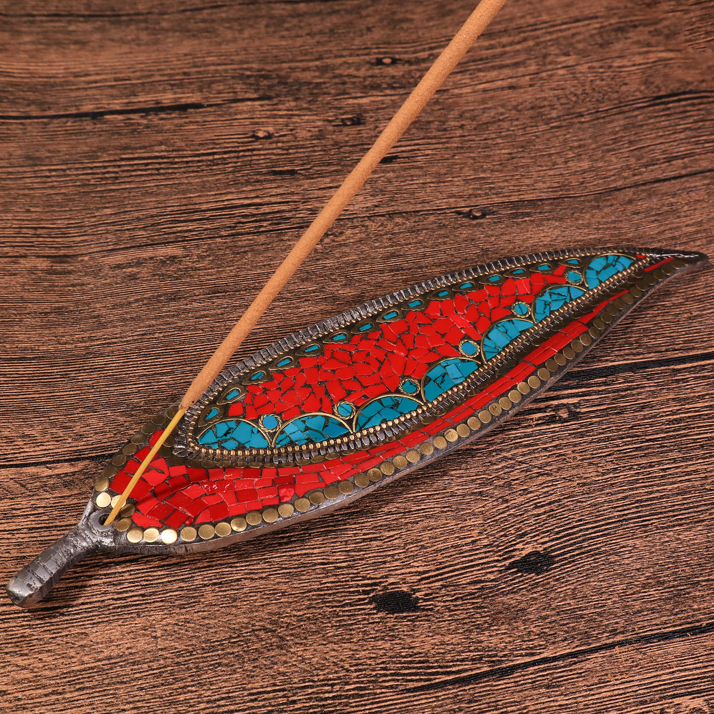 這款葉形線香座不僅是實用的香氛工具,更是一件充滿異國情調的藝術品,為您的空間注入來自大自然的能量。線香座以葉片為靈感,寓意生機與活力,其表面鑲嵌著珍貴的孔雀石與珊瑚,帶來獨特的視覺饗宴和靈性能量。